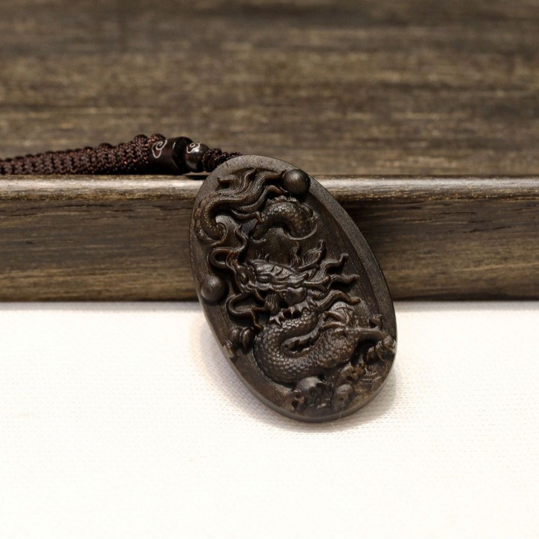 The amulet features an intricately carved dragon in pursuit of the mystical pearl, one of the most auspicious symbols in Asian culture. Each scale, claw, and whisker is meticulously detailed, showcasing the dragon's power and majesty in fluid motion across the agarwood's natural grain.