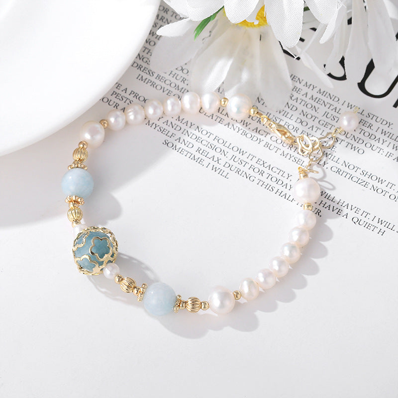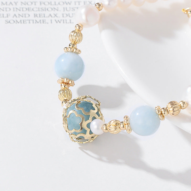 Meticulously crafted, this bracelet showcases the harmonious blend of elements that embody both classic beauty and natural grace. Each aquamarine crystal and pearl is chosen for its exquisite quality, creating a piece that exudes both style and meaningful energy.