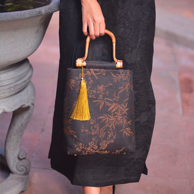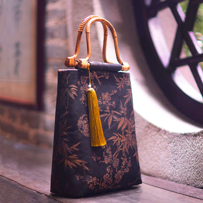 Vintage Mulberry Silk Tassel Bamboo Handle Flower Leaf Handbag