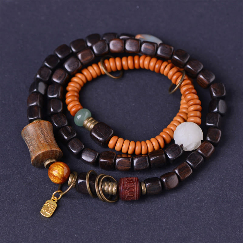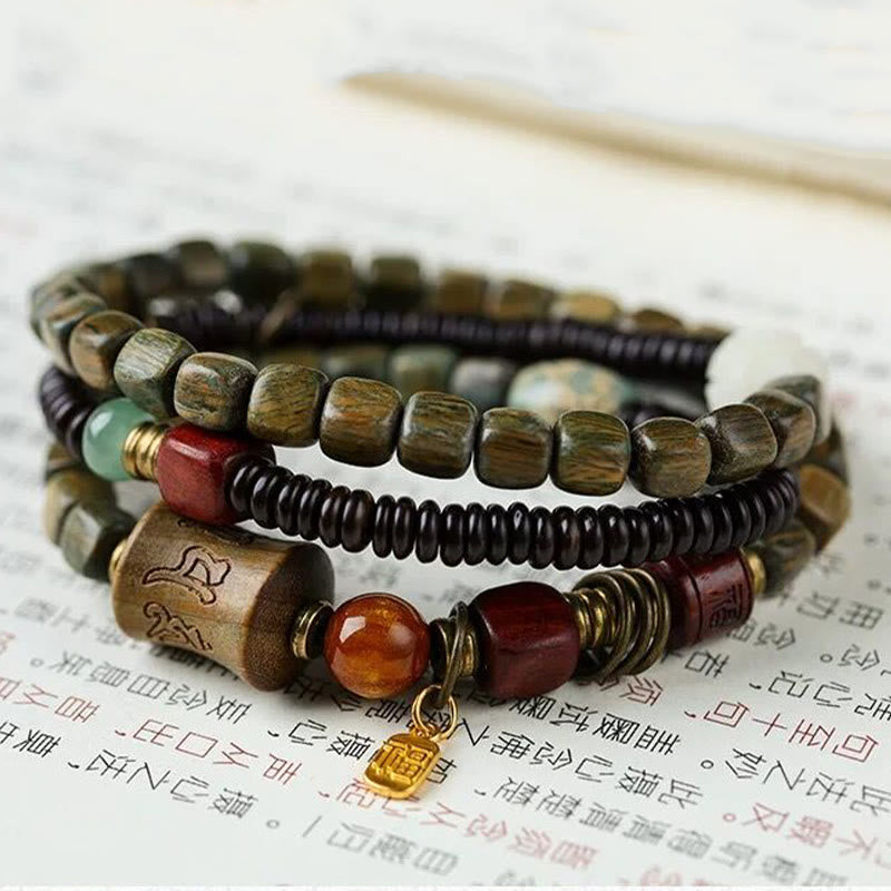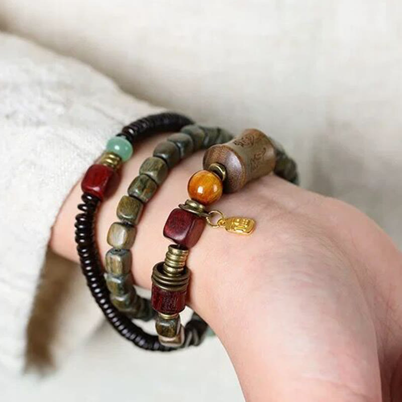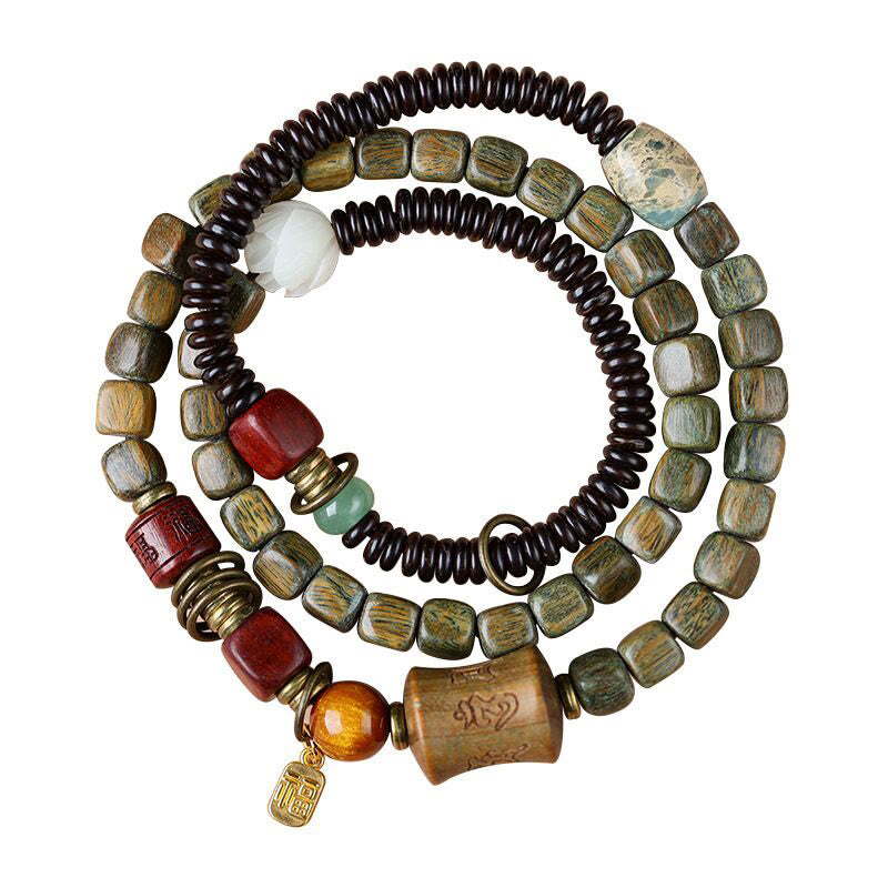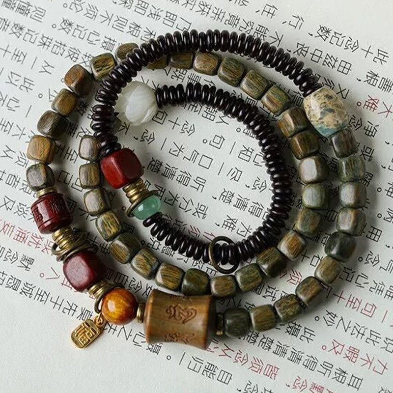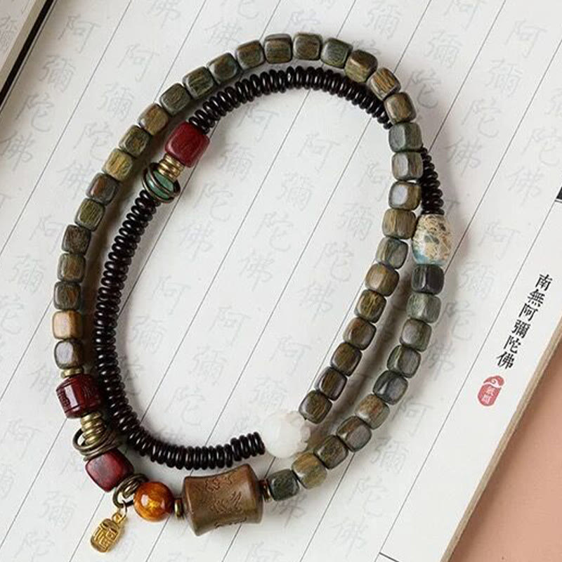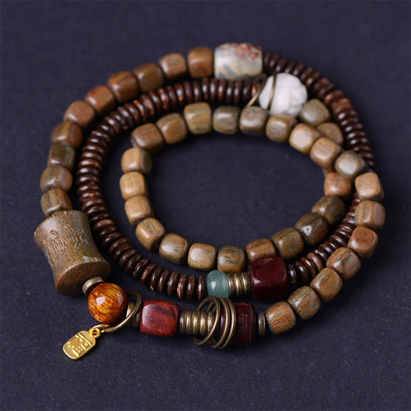 Green Sandalwood Ebony Om Mani Padme Hum Engraved Peace Triple Wrap Bracelet