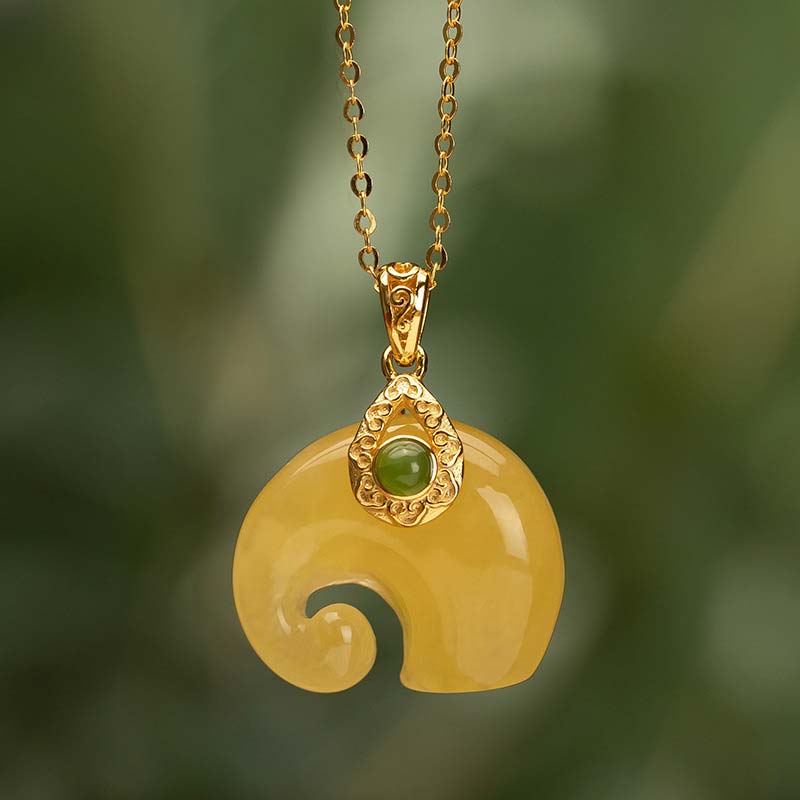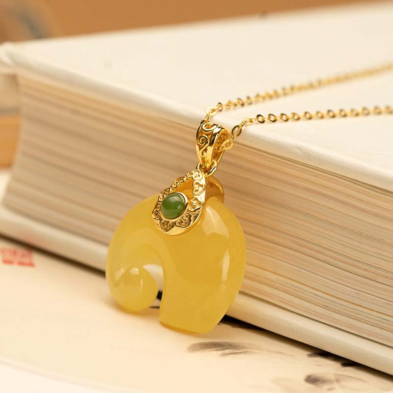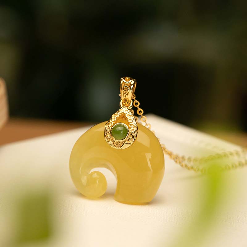 925 Sterling Silver Natural Amber Jade Elephant Blessing Necklace