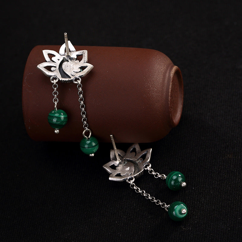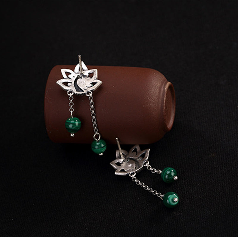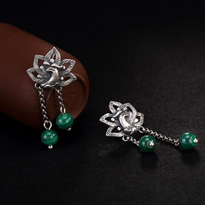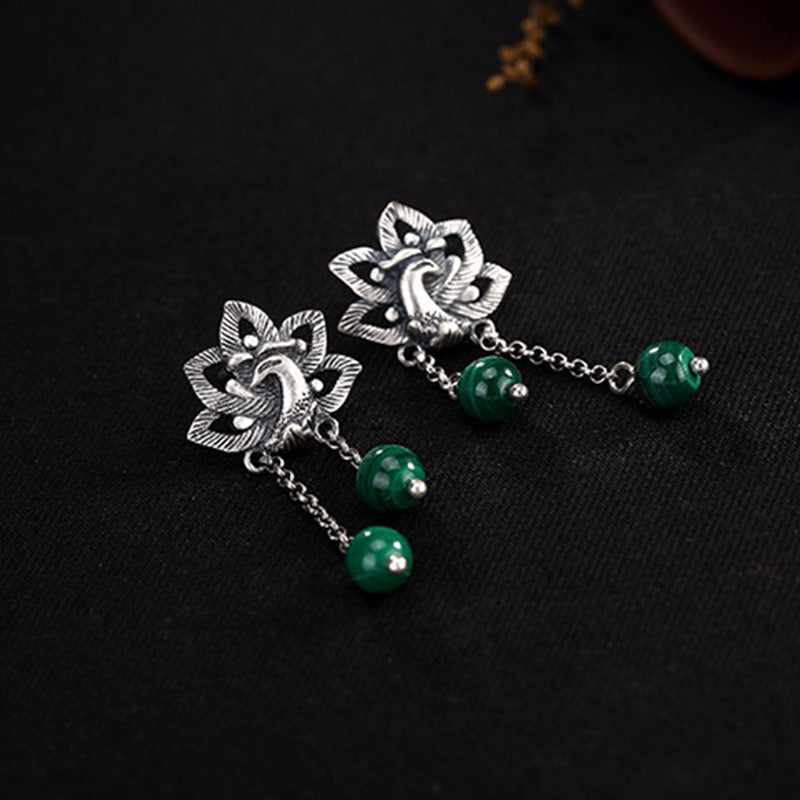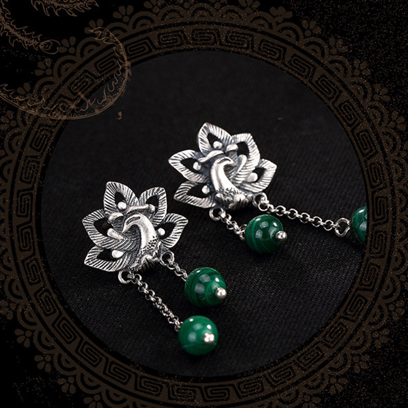 990 Sterling Silver Malachite Phoenix Peony Flower Bead Protection Drop Earrings