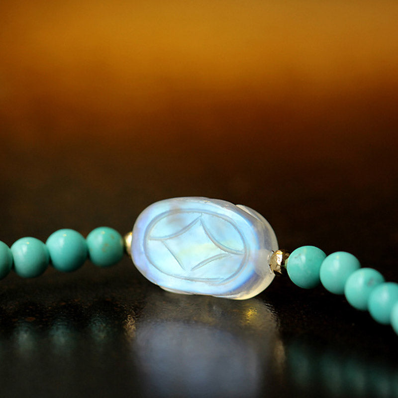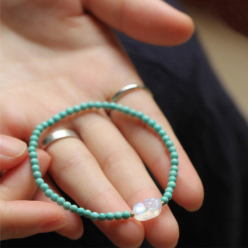 Turquoise has a soothing effect. Its appearance is elegant, its color is lustrous, and it feels delicate and cool. Wearing it on the body can help relieve tension and anxiety. In addition, turquoise contains a large amount of minerals and trace elements. These minerals and trace elements can enter the human body through the pores on the skin surface, thereby promoting human metabolism.